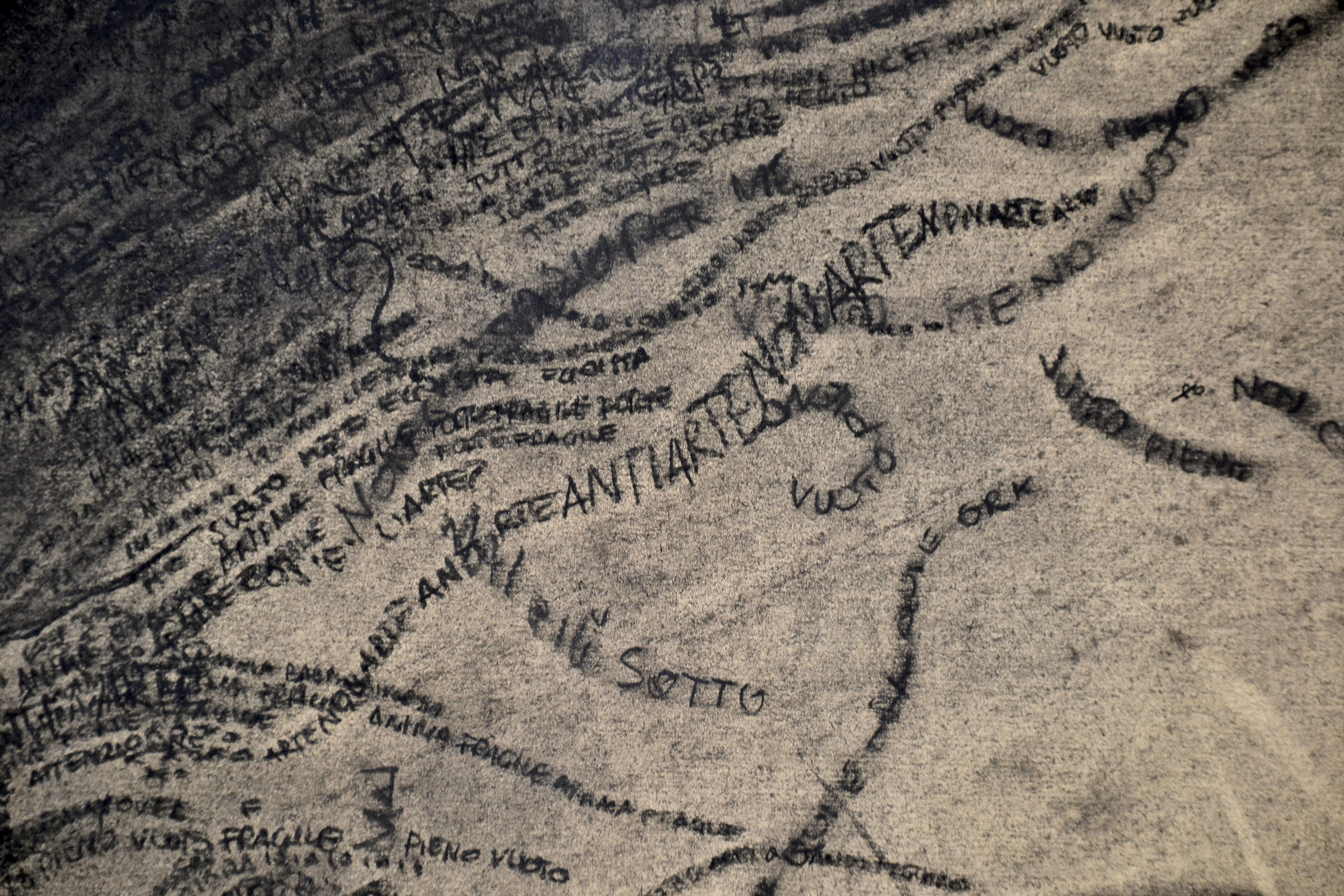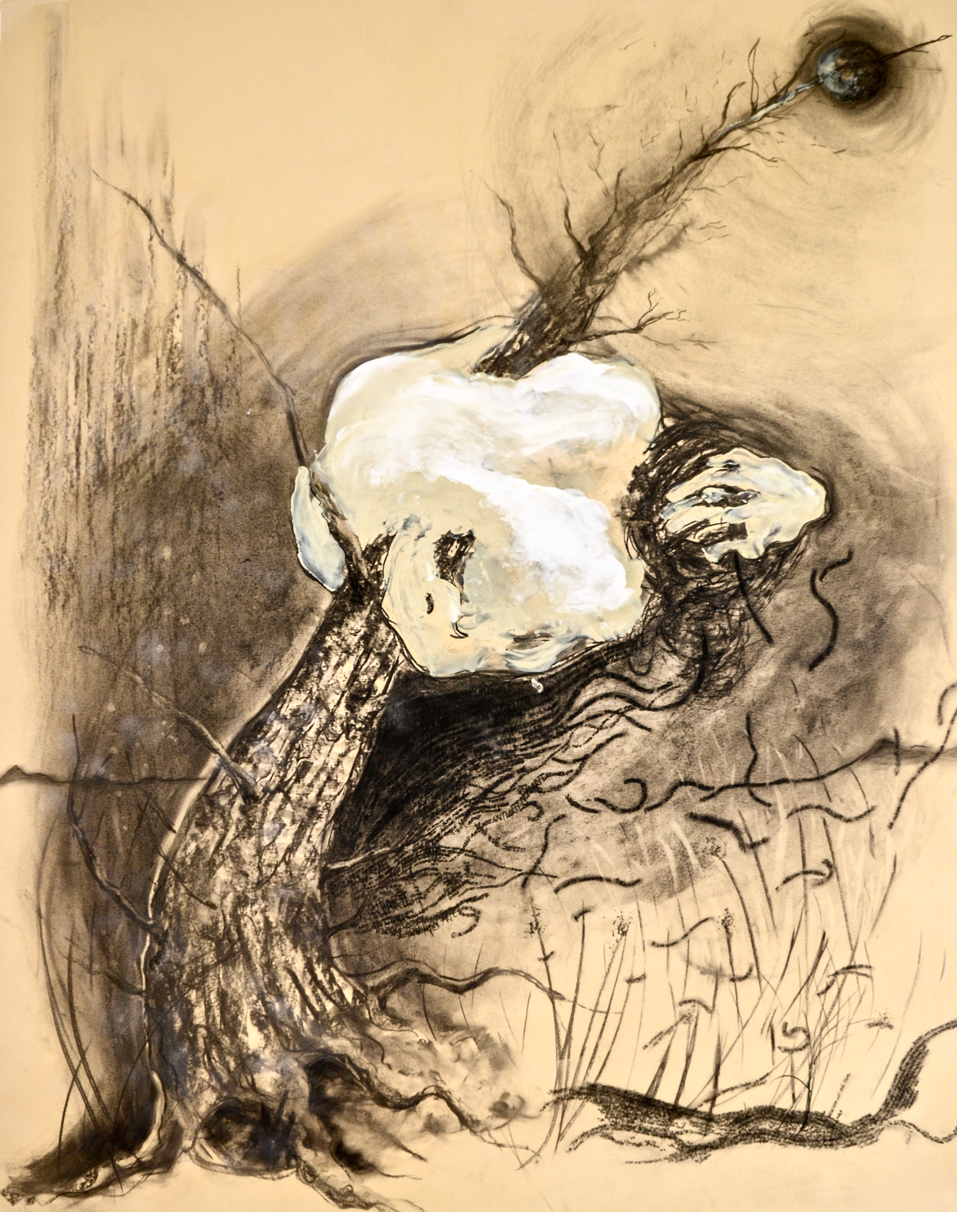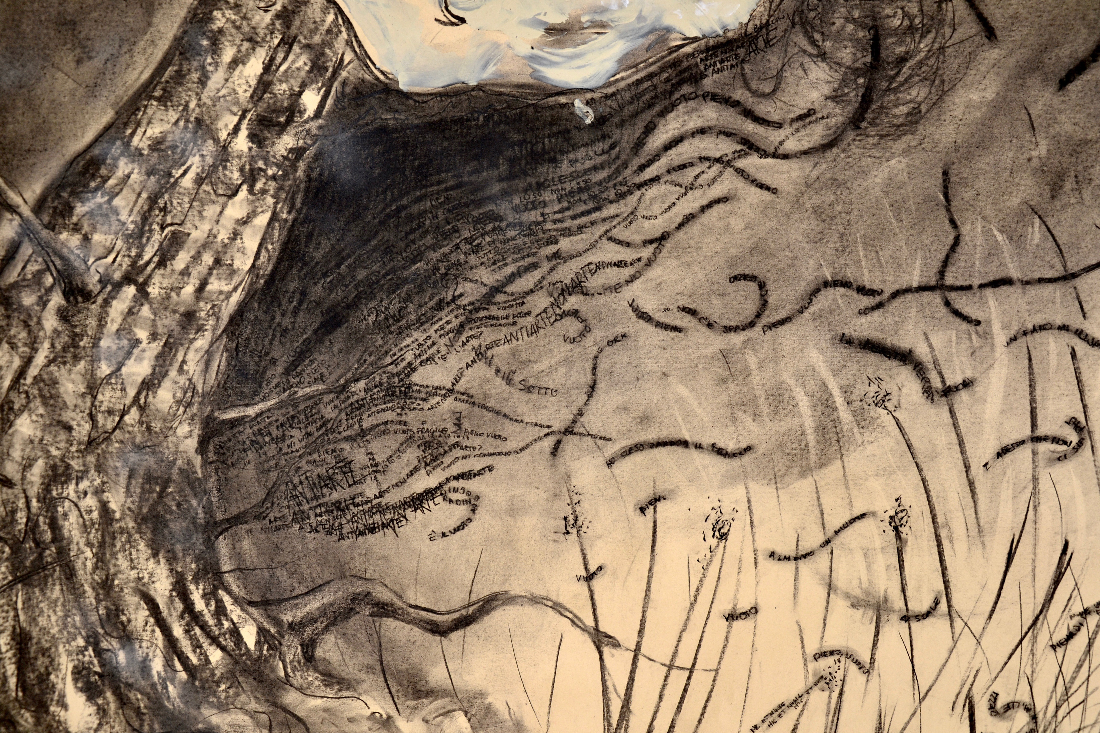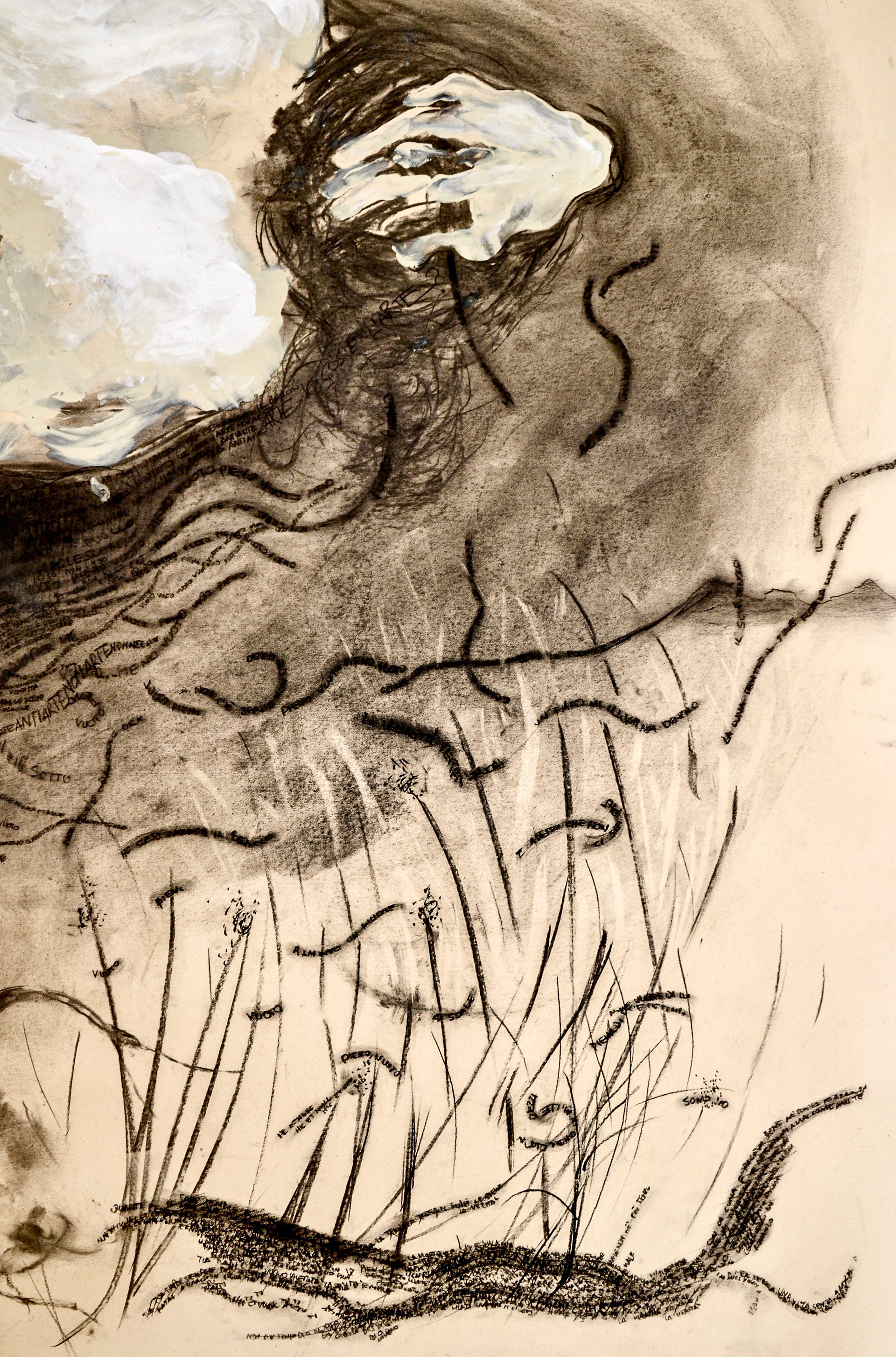 Miscelazioni: terre di forza, 2019, fusaggine, carboncino e acrilico su carta da spolvero, 120 x150 cm